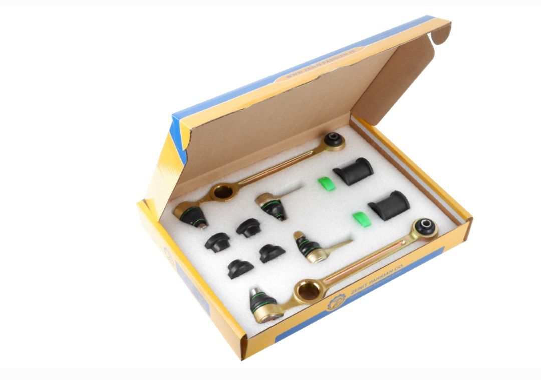 2 عدد طبق بوش لاستیکی ، 2 عدد سیبک (چپقی) فرمان ، 4عدد لاستیک تعادل ، 2 عدد لاستیک چاکدار (موجگیر) 4 عدد محافظ بوش طبق